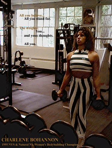 -Charlene Bohannon, 1995 NYS & Natural NE Womens Bodybuilding Champion, Trainer at MUSCLE WORLD GYM, 82 E Main St., Webster, NY 14580